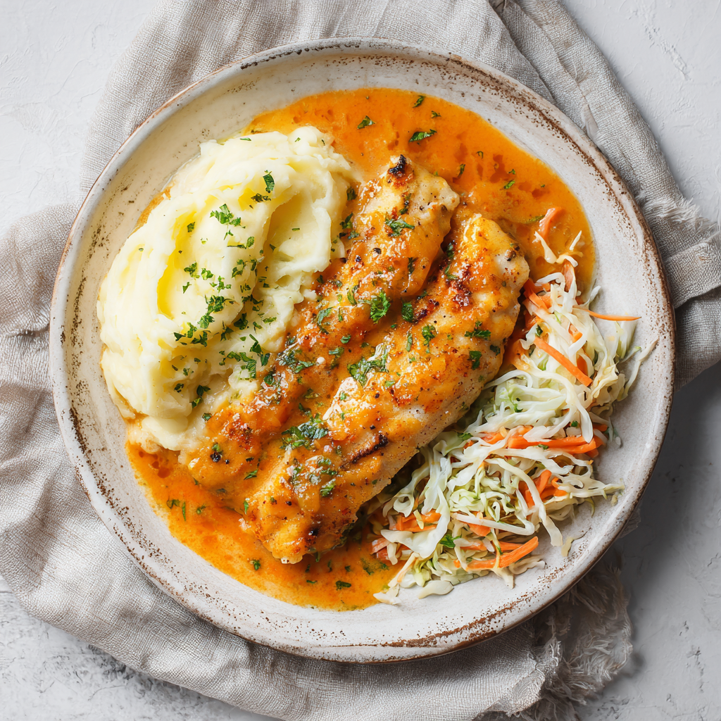 Filet rybny w sosie pieprzowym podawany z puree i surówką colesław