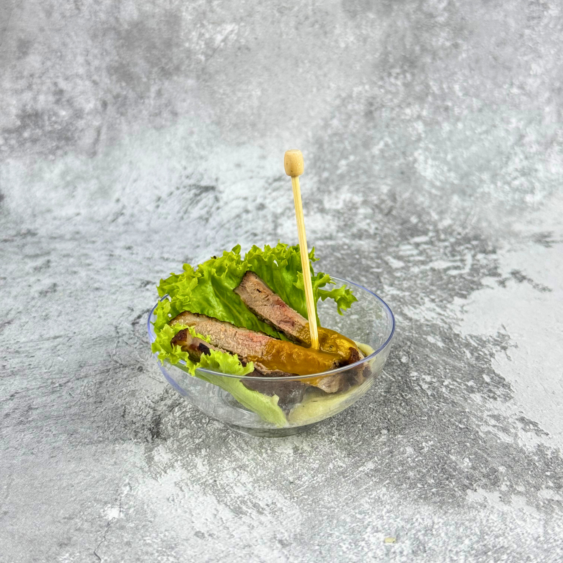 Filet z kaczki w brandy na chutney z mango i chilli na musie z selera naciowego.