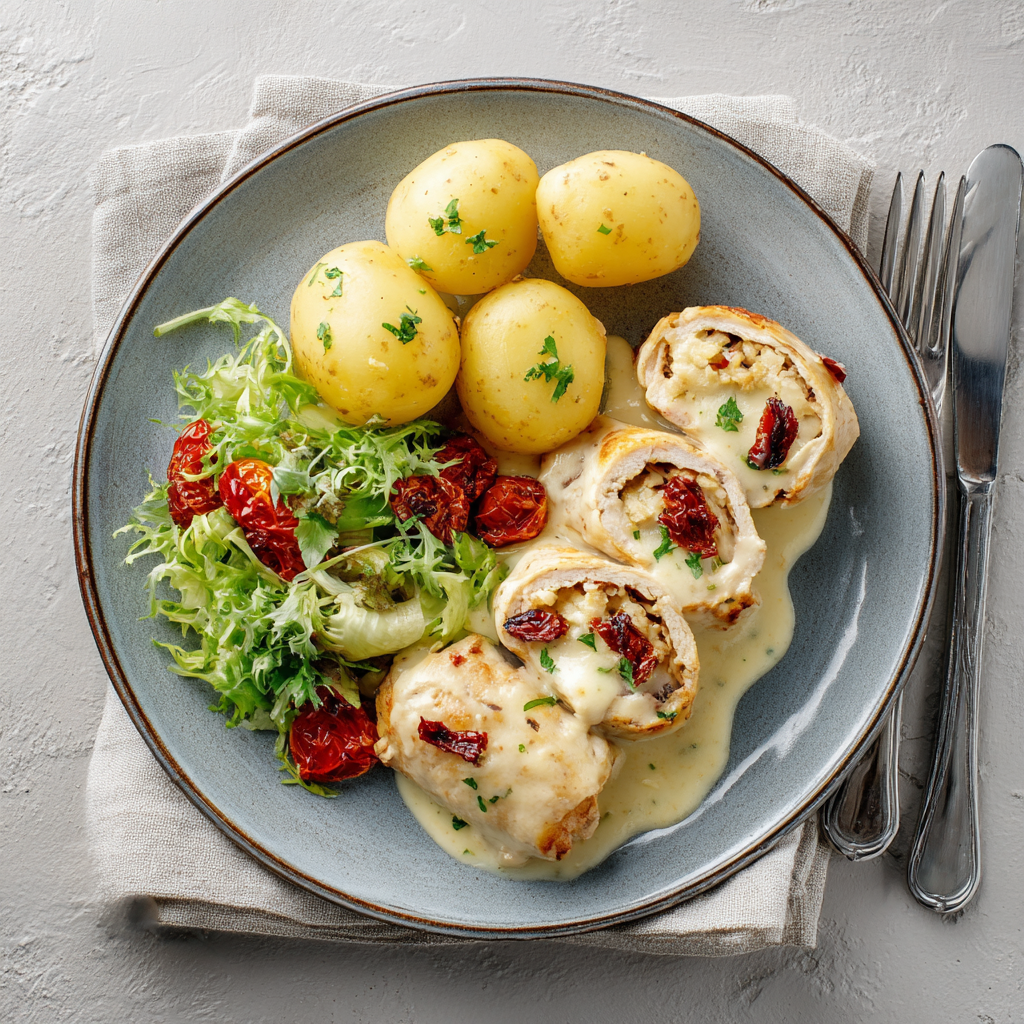Roladki drobiowe z suszonymi pomidorami i mozzarellą w sosie śmietanowym podawany z ziemniakami z wody i mixem sałat