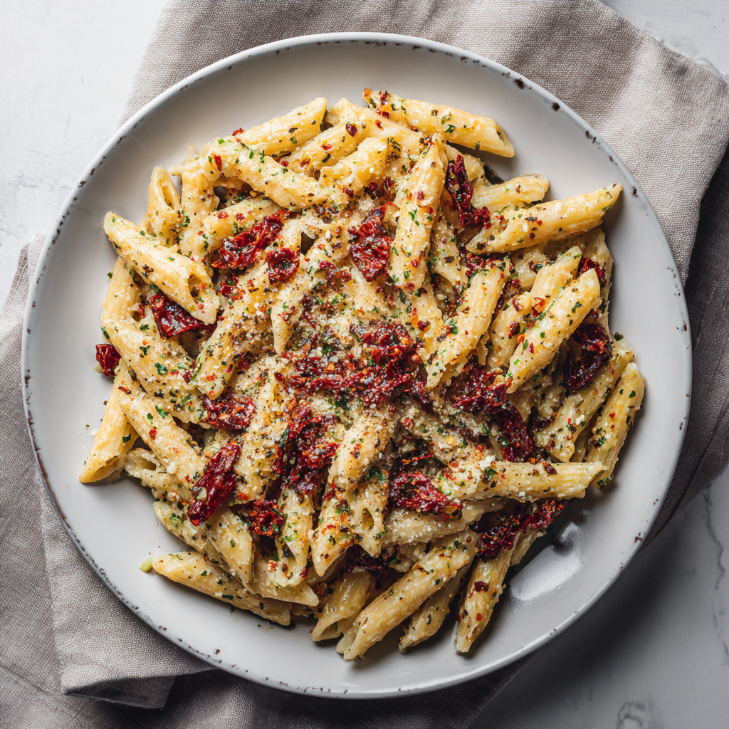 Penne pełnoziarniste z suszonymi pomidorami i sosem śmietanowo bazyliowym