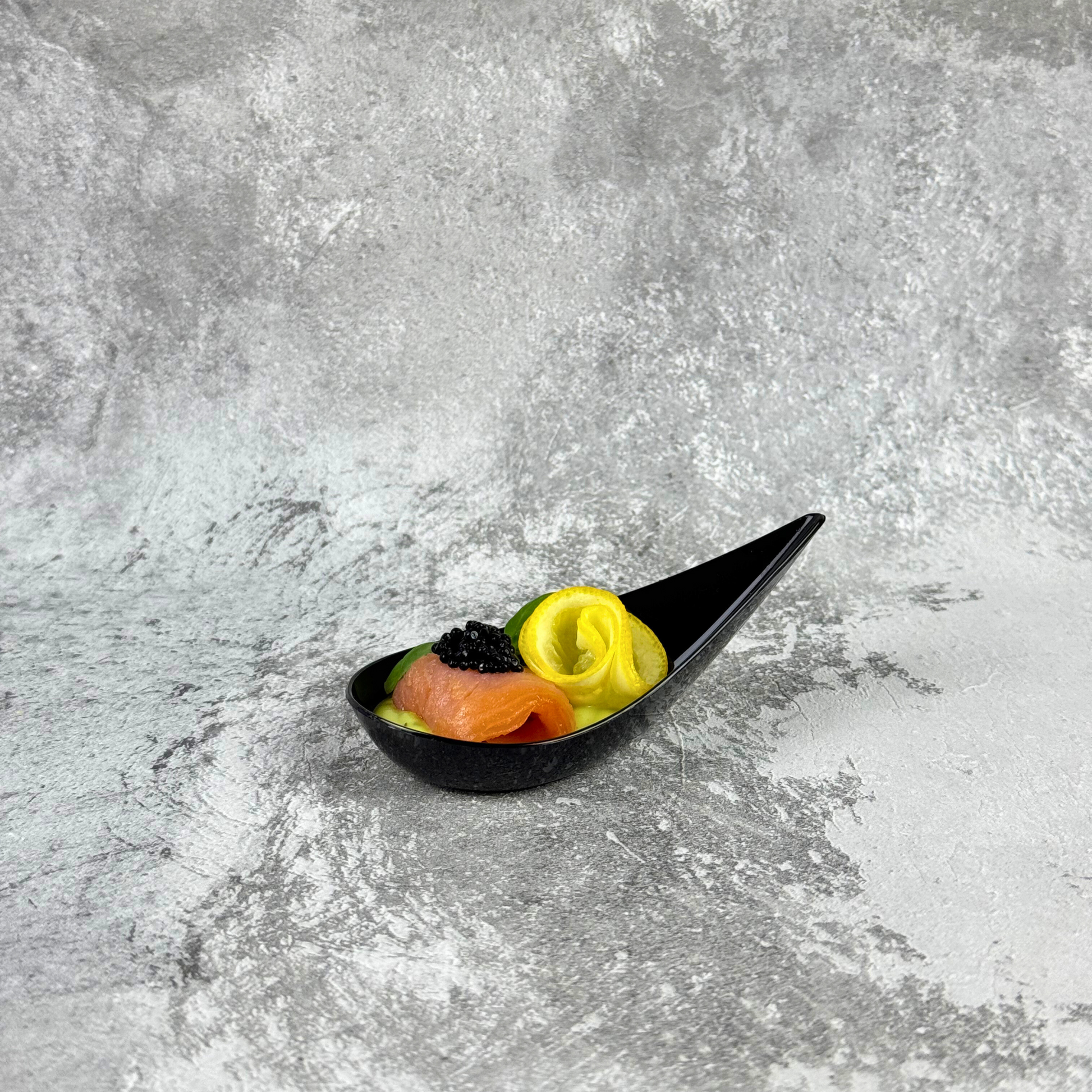 Łosoś wędzony podawany z czarnym kawiorem i cytryną na musie bazyliowym.