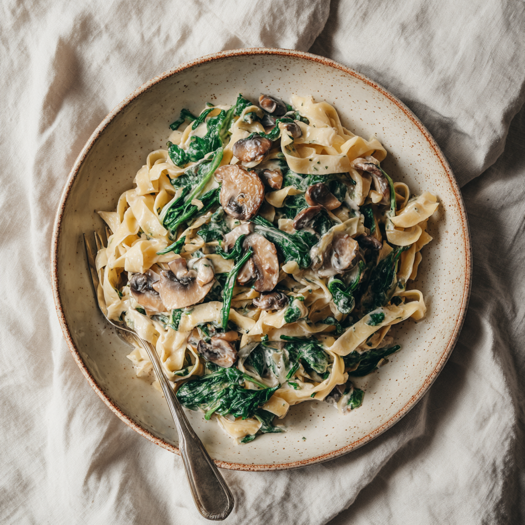 Makaron tagliatelle ze szpinakiem i sosem z leśnych grzybów