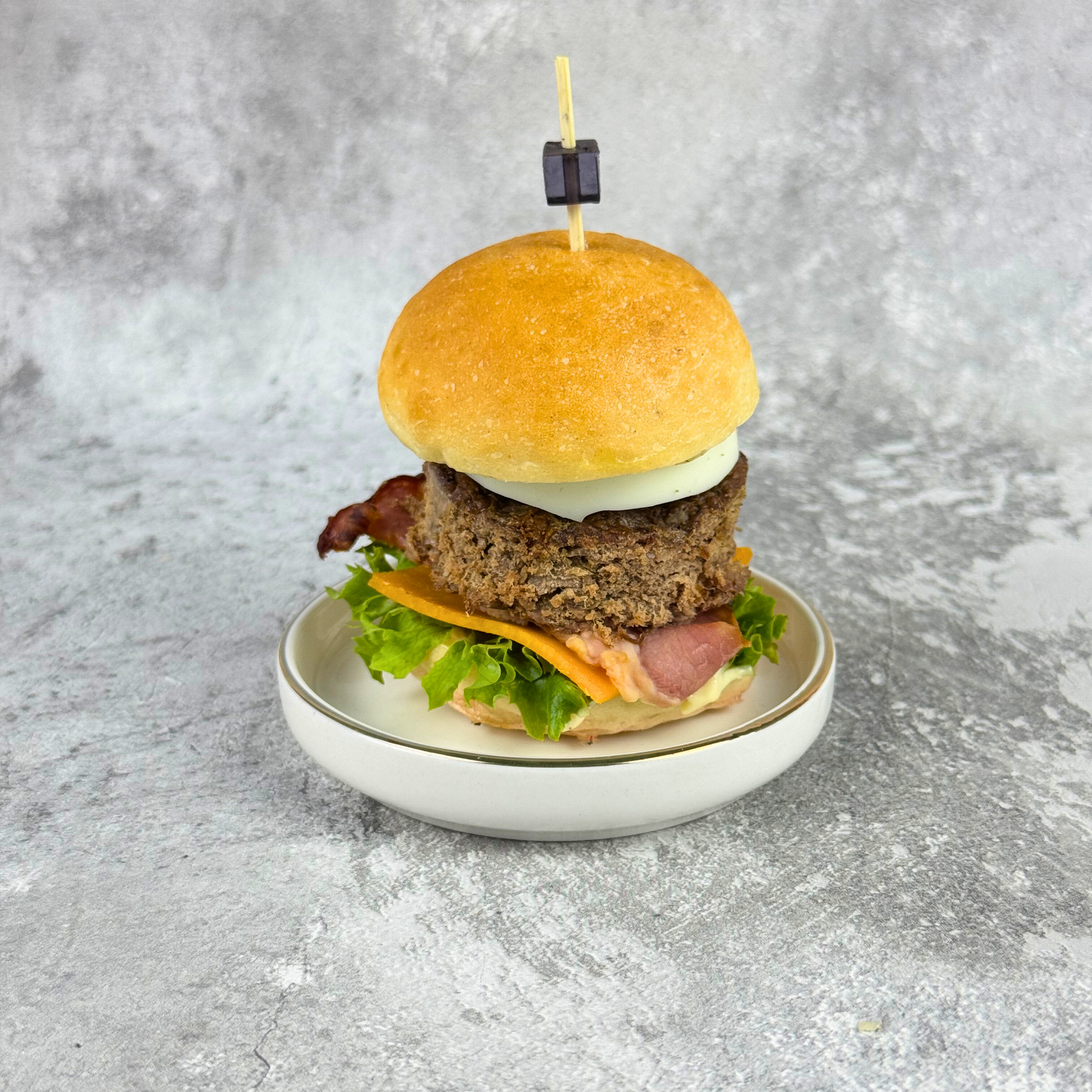 Mini burger wołowy z jajkiem, beconem, sałata lodowa, ser mimolette, sos majonezowy.