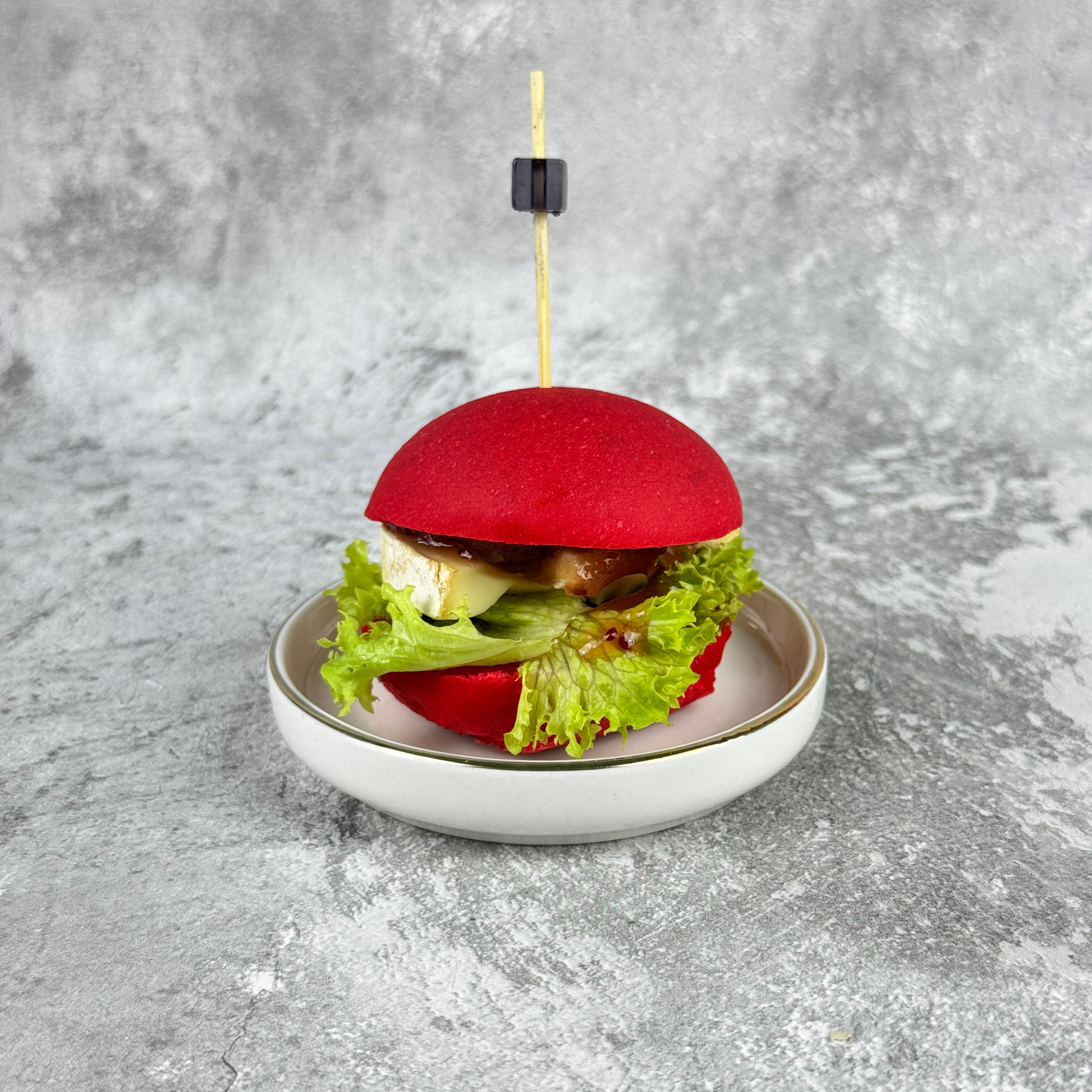 Mini burger ze smażonym camembertem, sałatą i żurawiną.