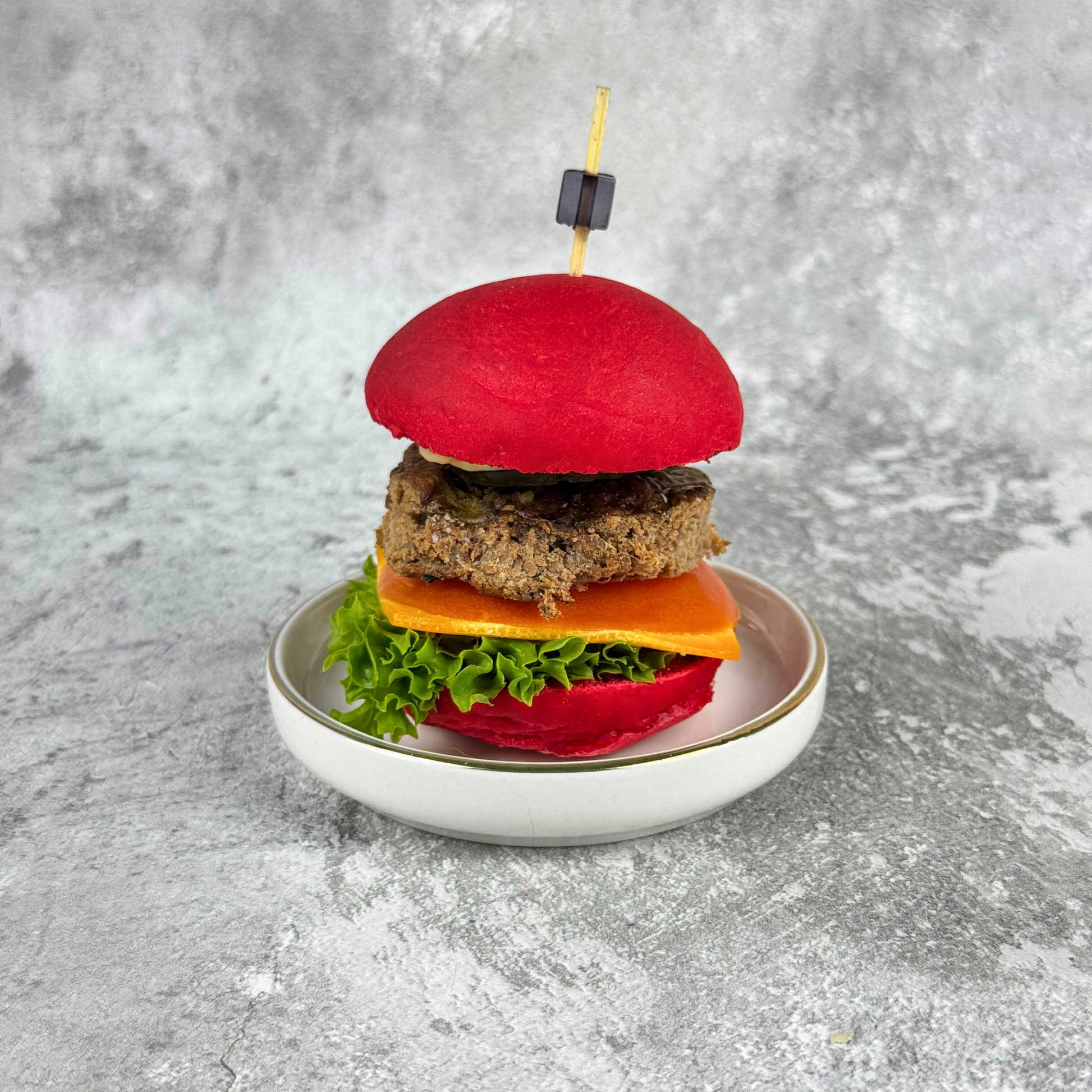 Mini cheeseburger z wołowiną, serem mimolette, sałatą, pomidorem, ogórkiem kiszonym i sosem majonezowym.