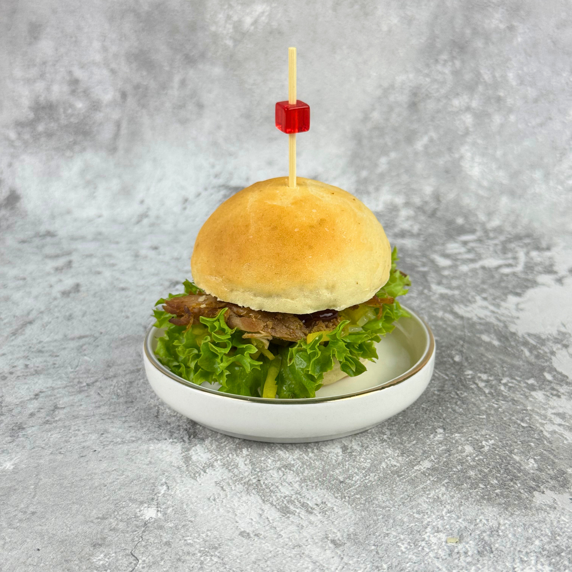 Mini burger z szarpana wieprzowiną, jalapeno, pikle, salsa pomidorowa