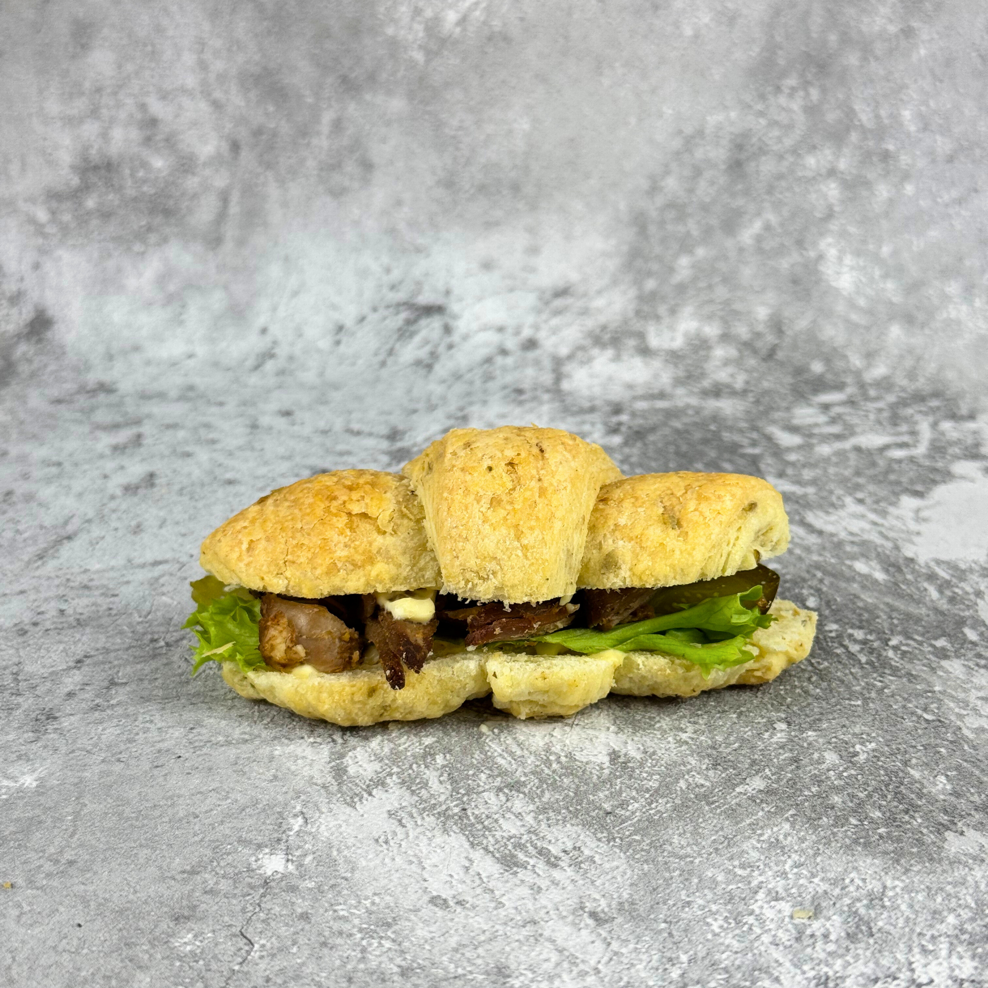 Mini croissant z szarpana wieprzowiną, sałata, ogórkiem kiszonym, chrupką cebulą i sosem majonezowym