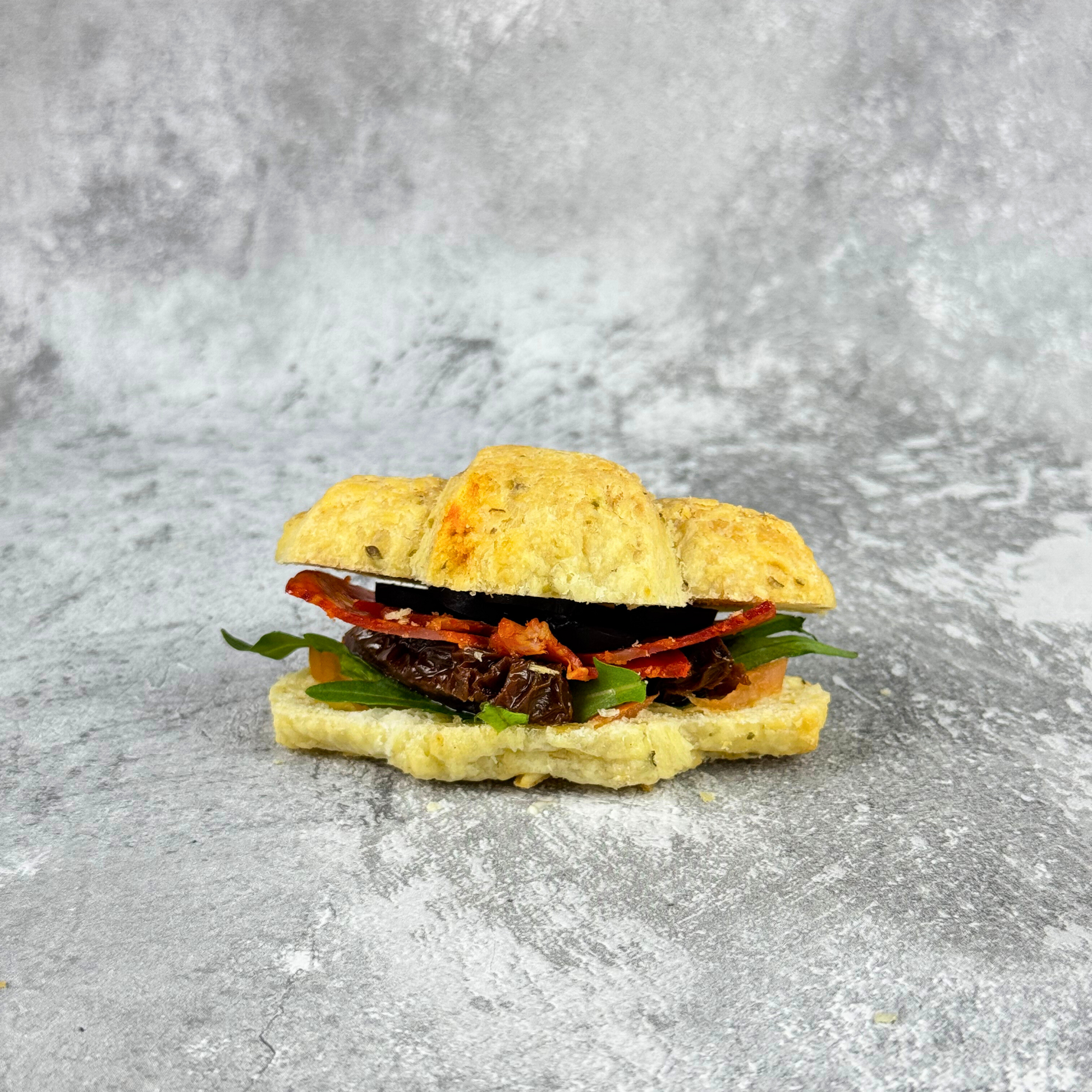 Mini croissant z chorizo, rukolą, oliwkami, suszonymi pomidorami i salsą.