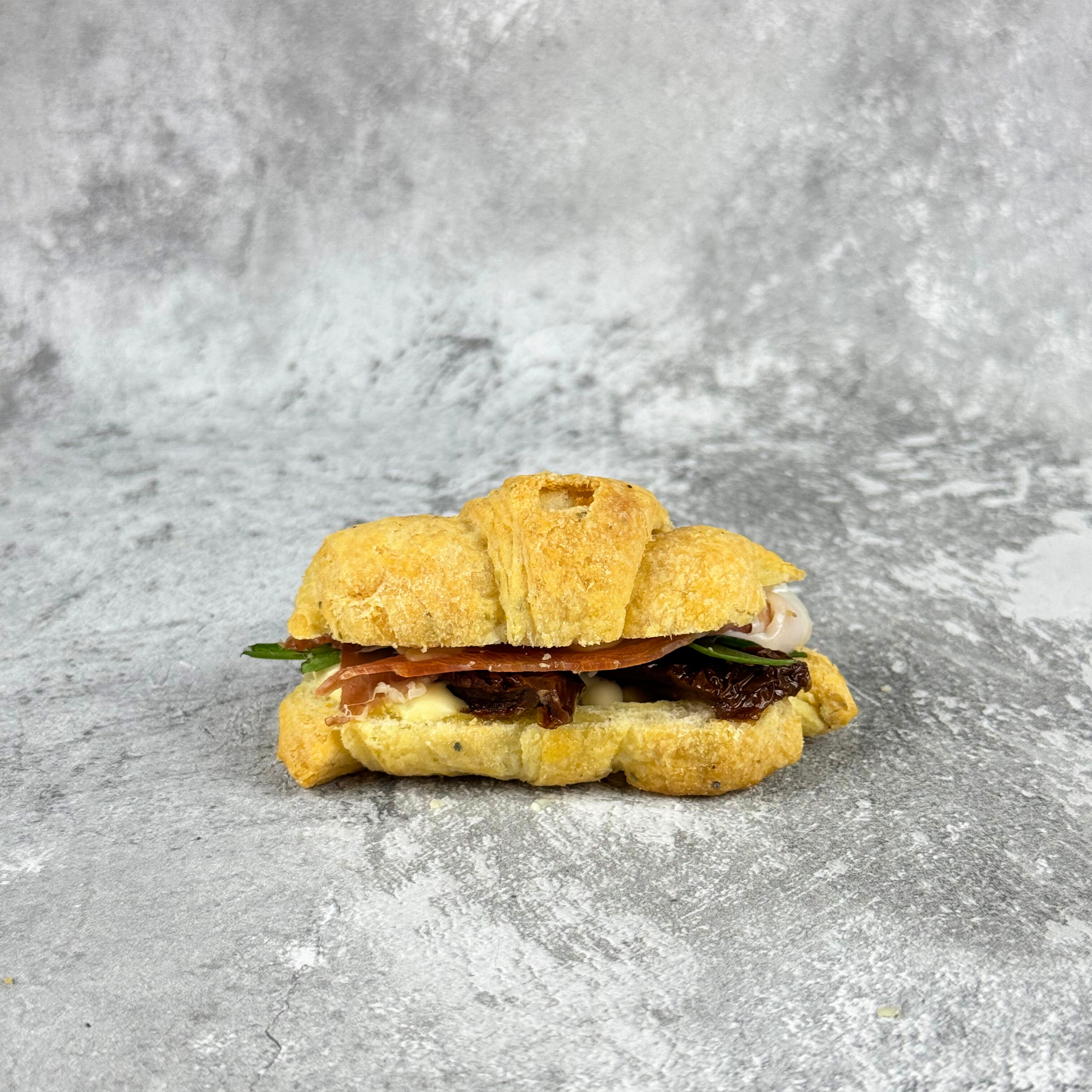 Mini croissant z szynką parmeńską, parmezanem, pomidorem suszonym oraz twarogiem.