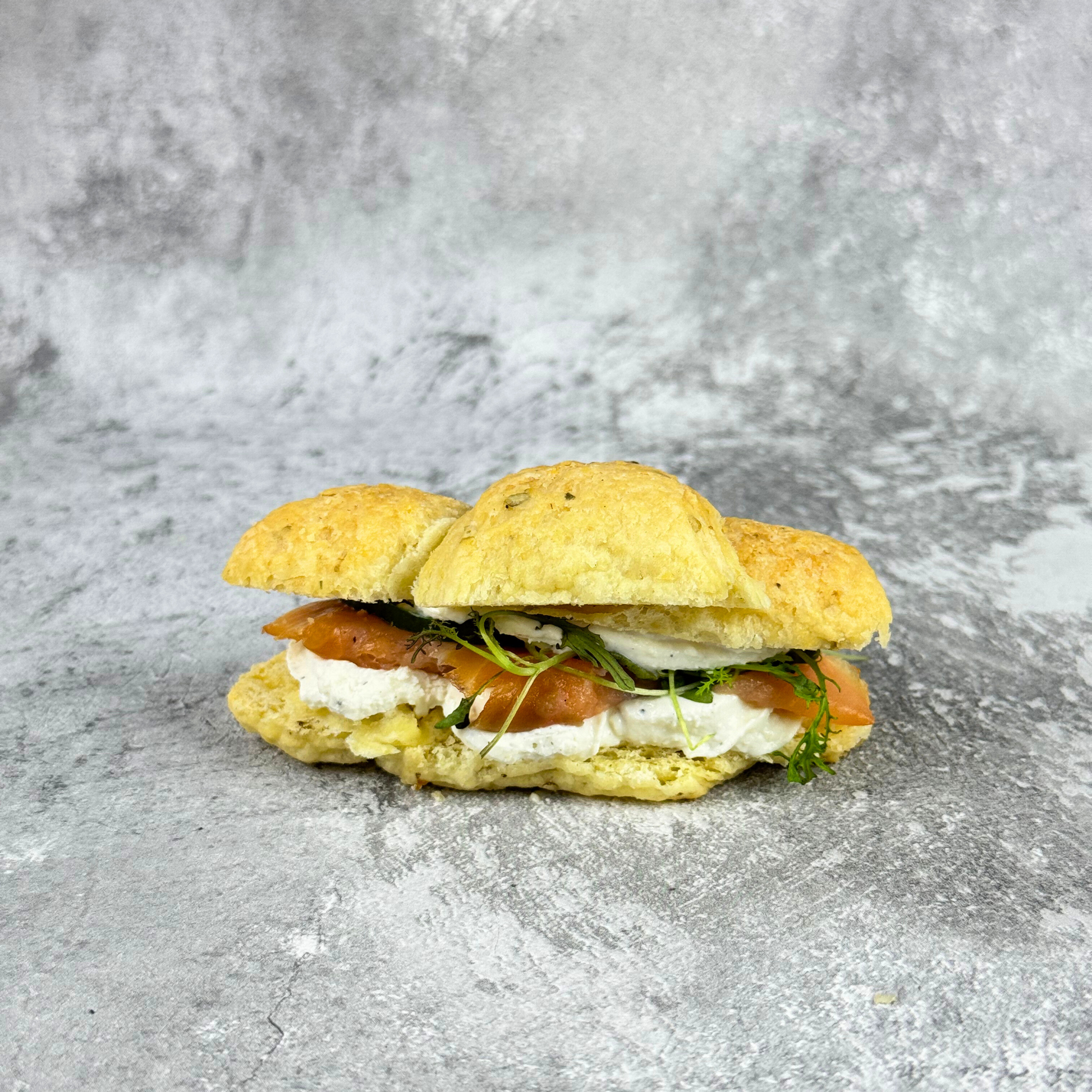 Mini croissant z łososiem, serkiem śmietanowym, ogórkiem i kiełkami.