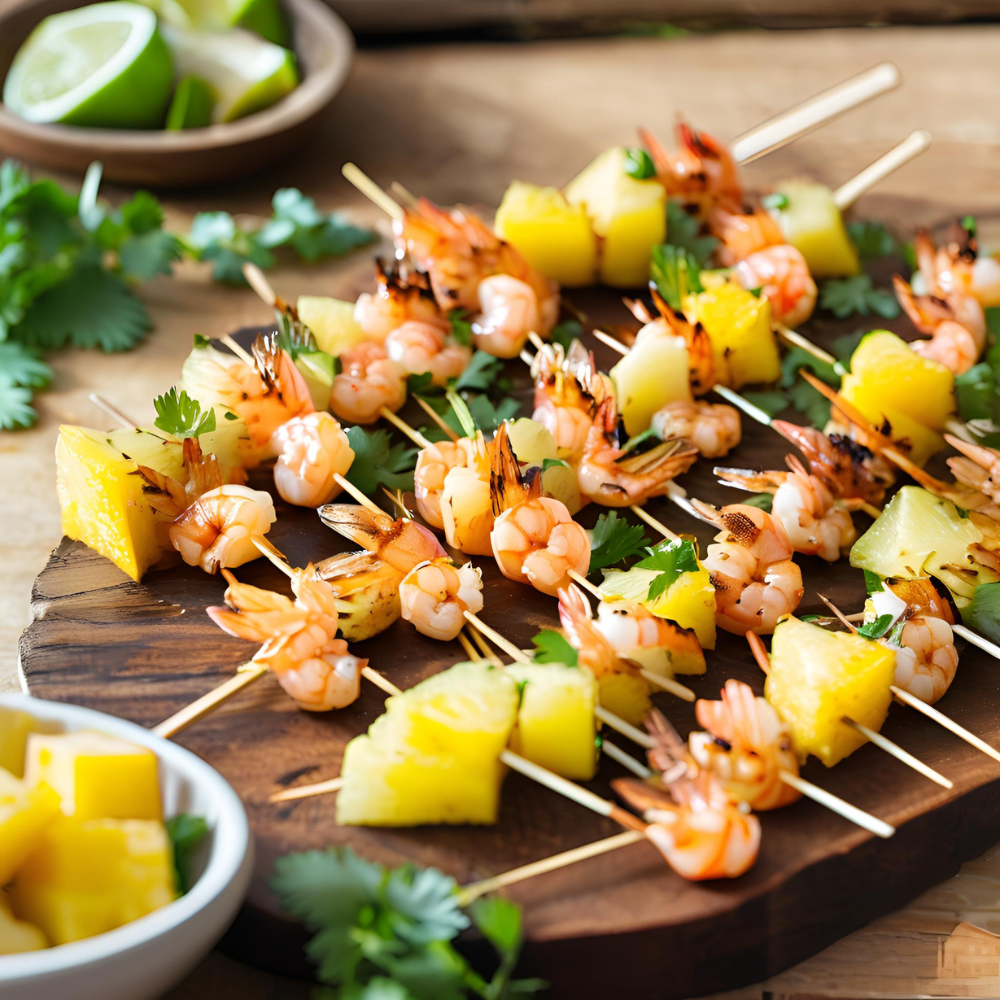 Mini szaszłyki z krewetkami, z grillowanym ananasem i kolendrą