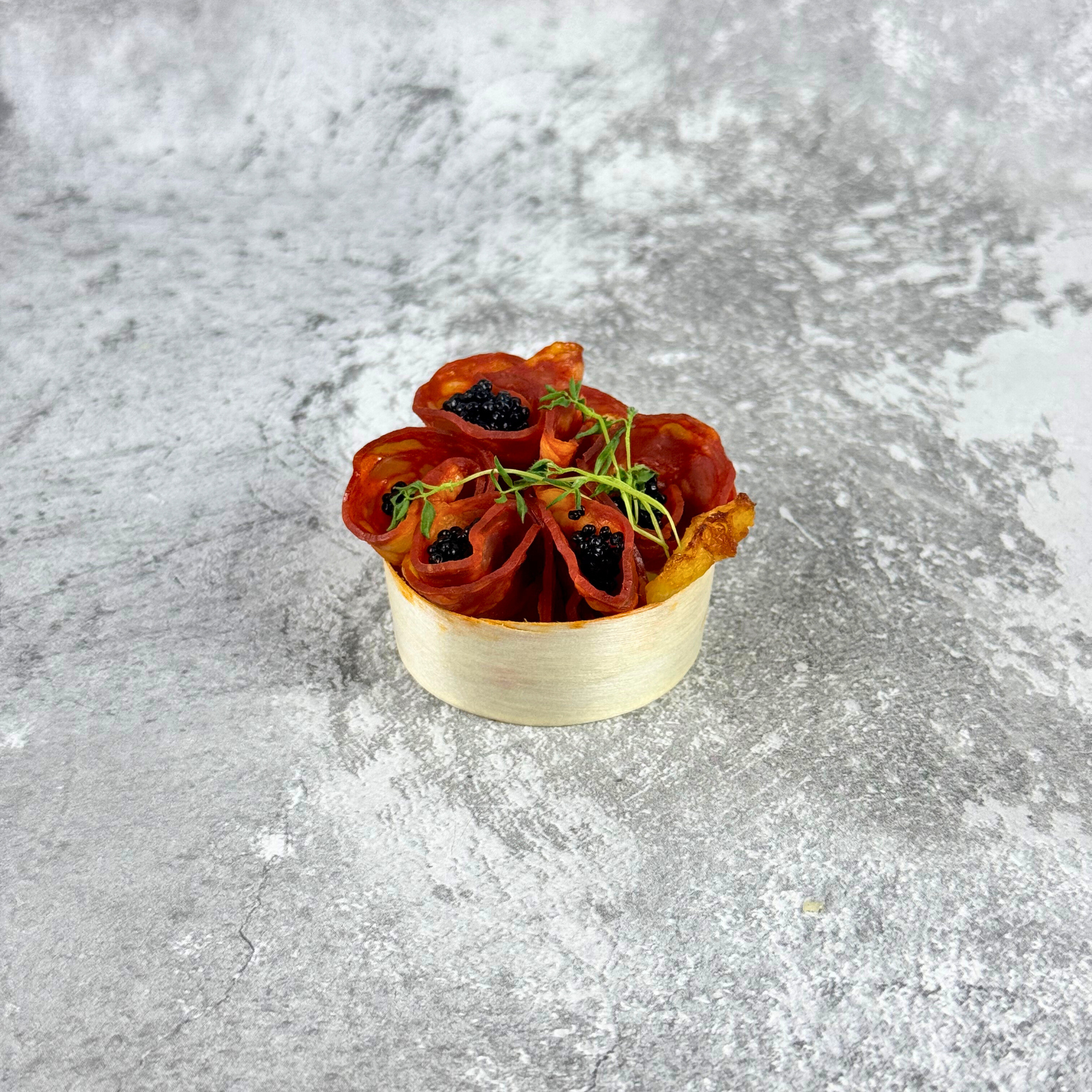 Pikantne chorizo marynowane w syropie klonowym na cytrusowym kawiorze z chipsem ananasa