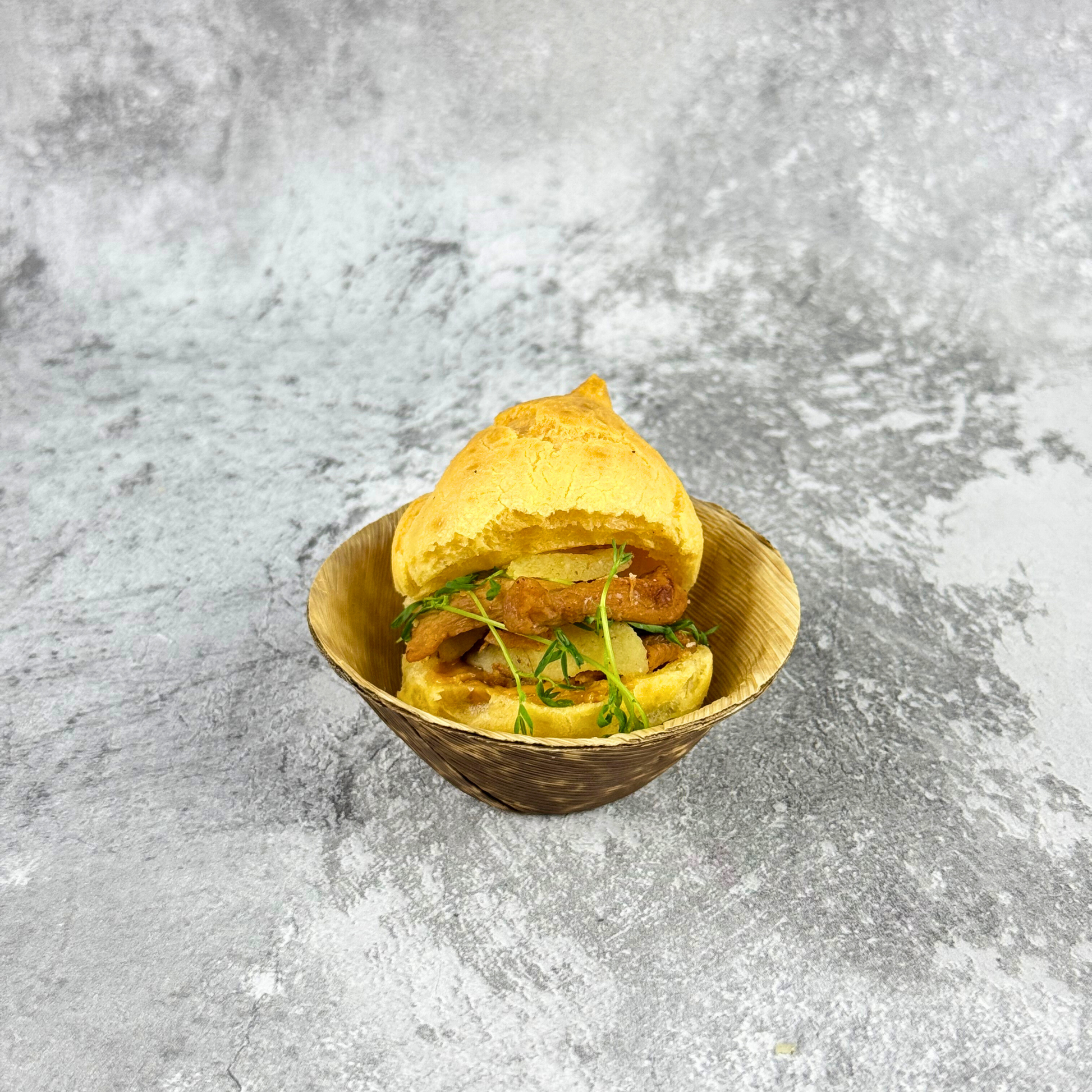 Ptysie przekładane hummusem podane z karmelizowanymi kurkami i jabłkiem.