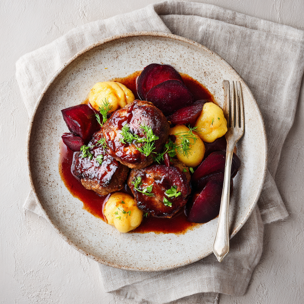 Bitki wołowe w sosie własnym podawane z kluskami i burakami glazurowanymi