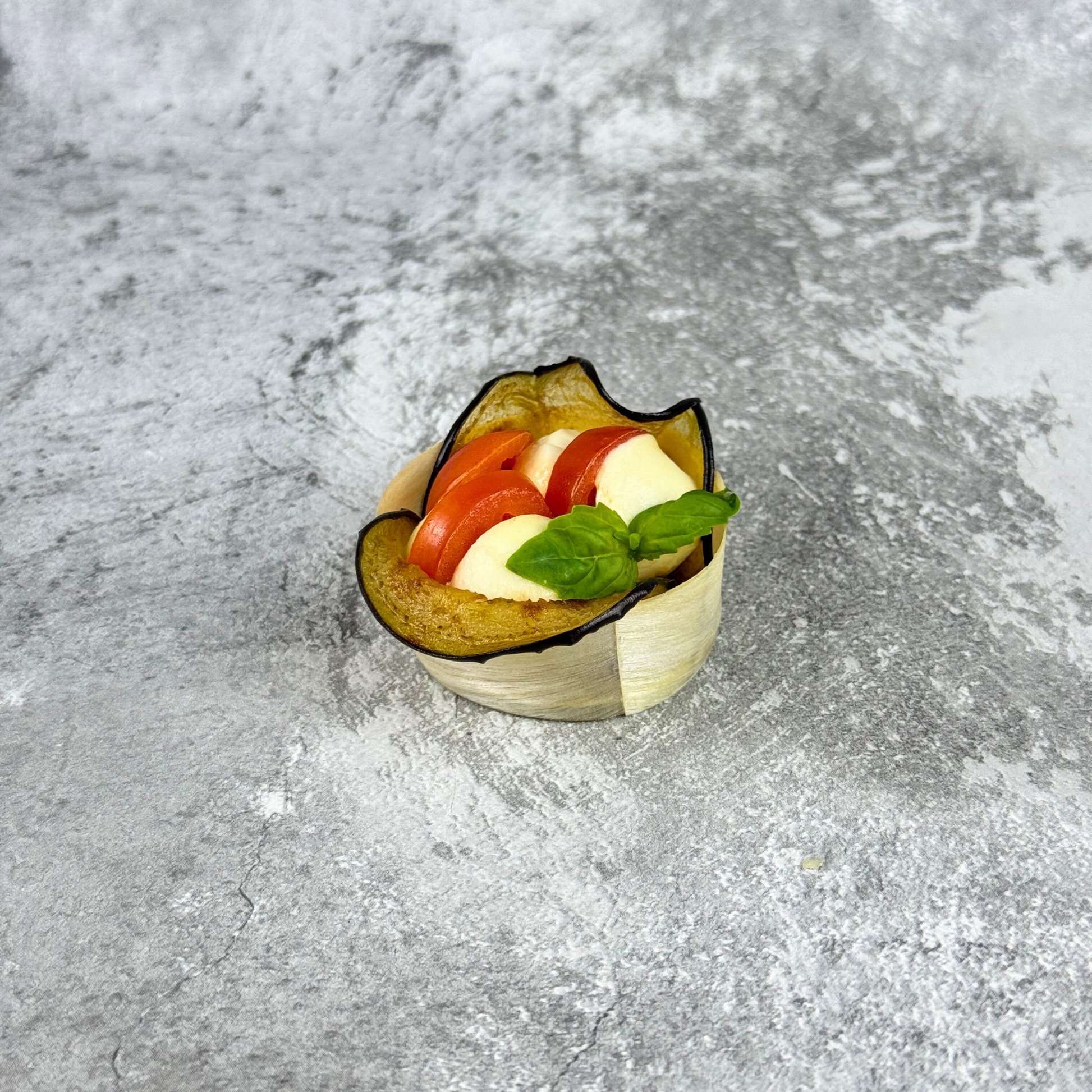 Caprese z mozzarellą di bufala z pesto z suszonych pomidorów i chrupiącym plastrem bakłażana