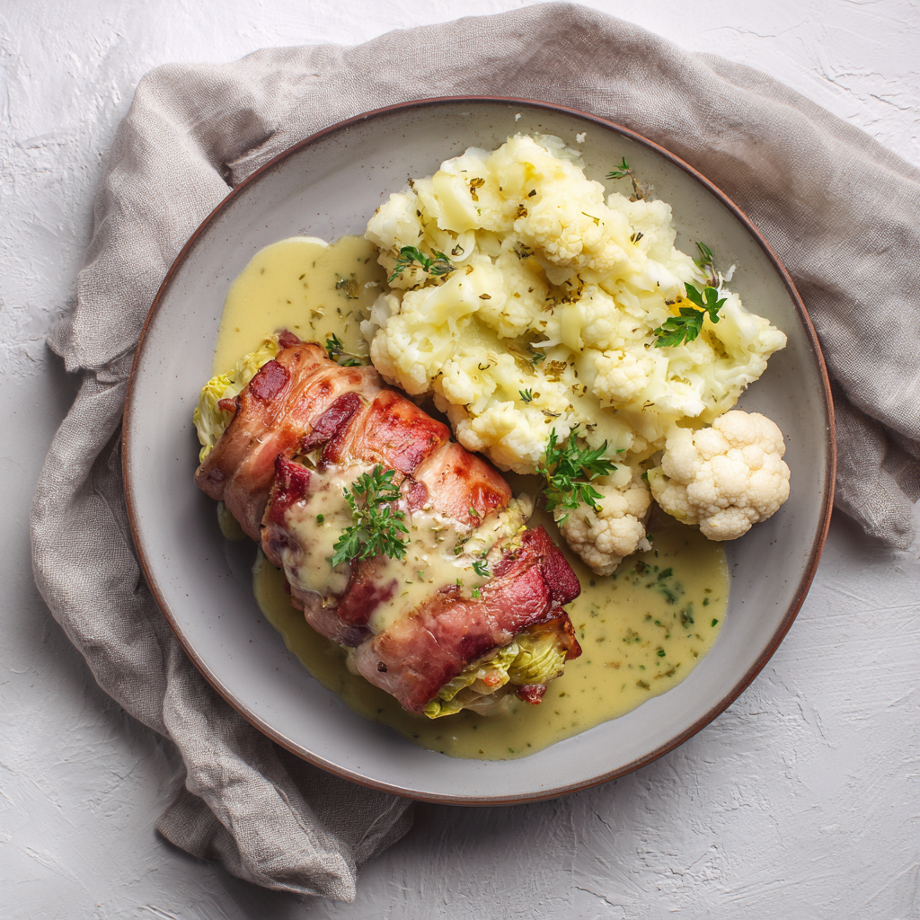 Sakiewka wieprzowa faszerowana porem i boczkiem podana z sosem tymiankowym podawana z puree i kalafiorem