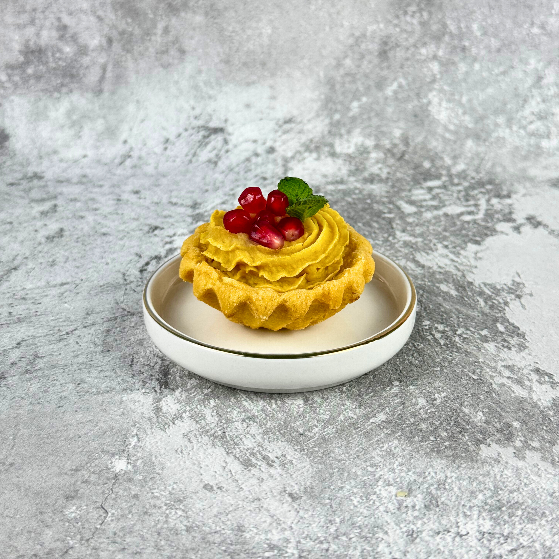 Tartaletki z pastą z ciecierzycy aromatyzowane sezamem podawane z pestkami granatu i miętą.