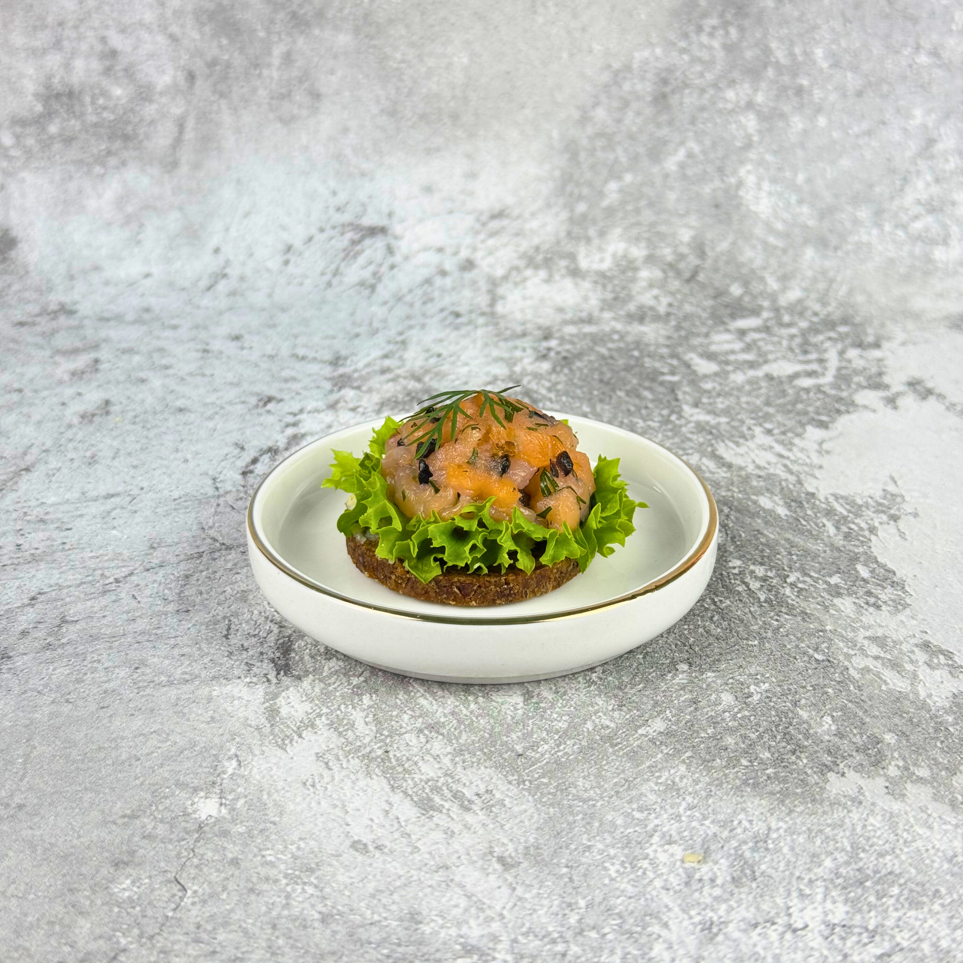 Tatar z łososia na pumperniklu, aromatyzowany limonką poddawany z kaparami.