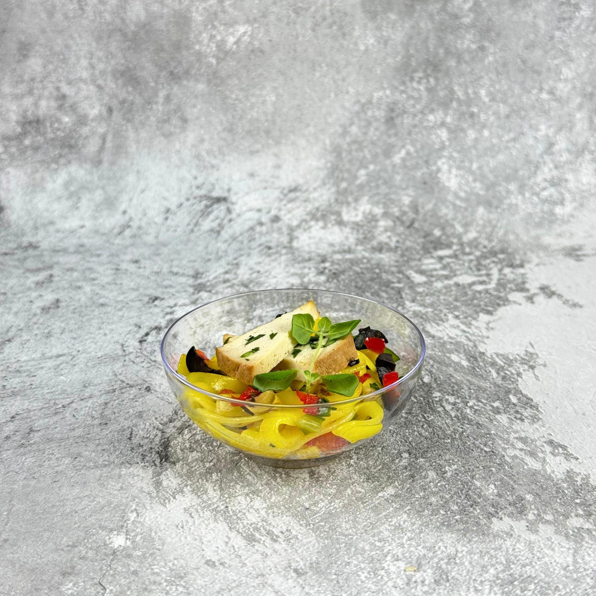 Tofu marynowane z kolendrą i czosnkiem na sałatce z makaronu sojowego i słodko- kwaśnego sosu.