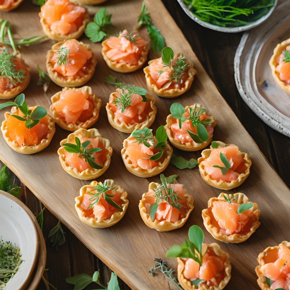 Zestaw 25 wykwintnych przekąsek typu finger food, idealnych na spotkania firmowe, przyjęcia i eleganckie kolacje.